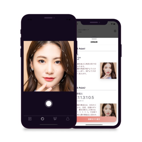 両目と鼻を結ぶ三角形の形で印象が変わります。鼻の位置の角度が60°より小さいと大人っぽく、60°より大きいと若く見えます。